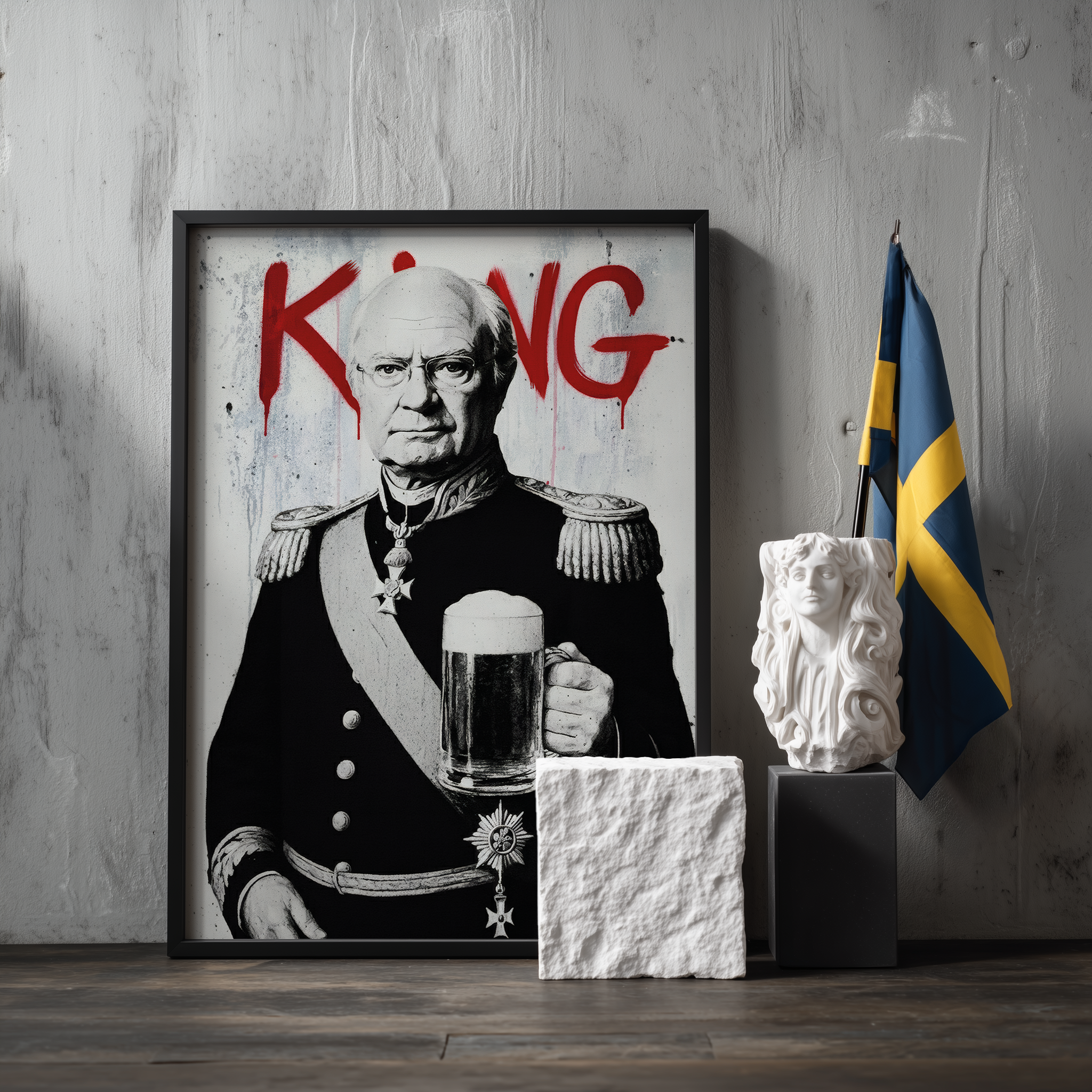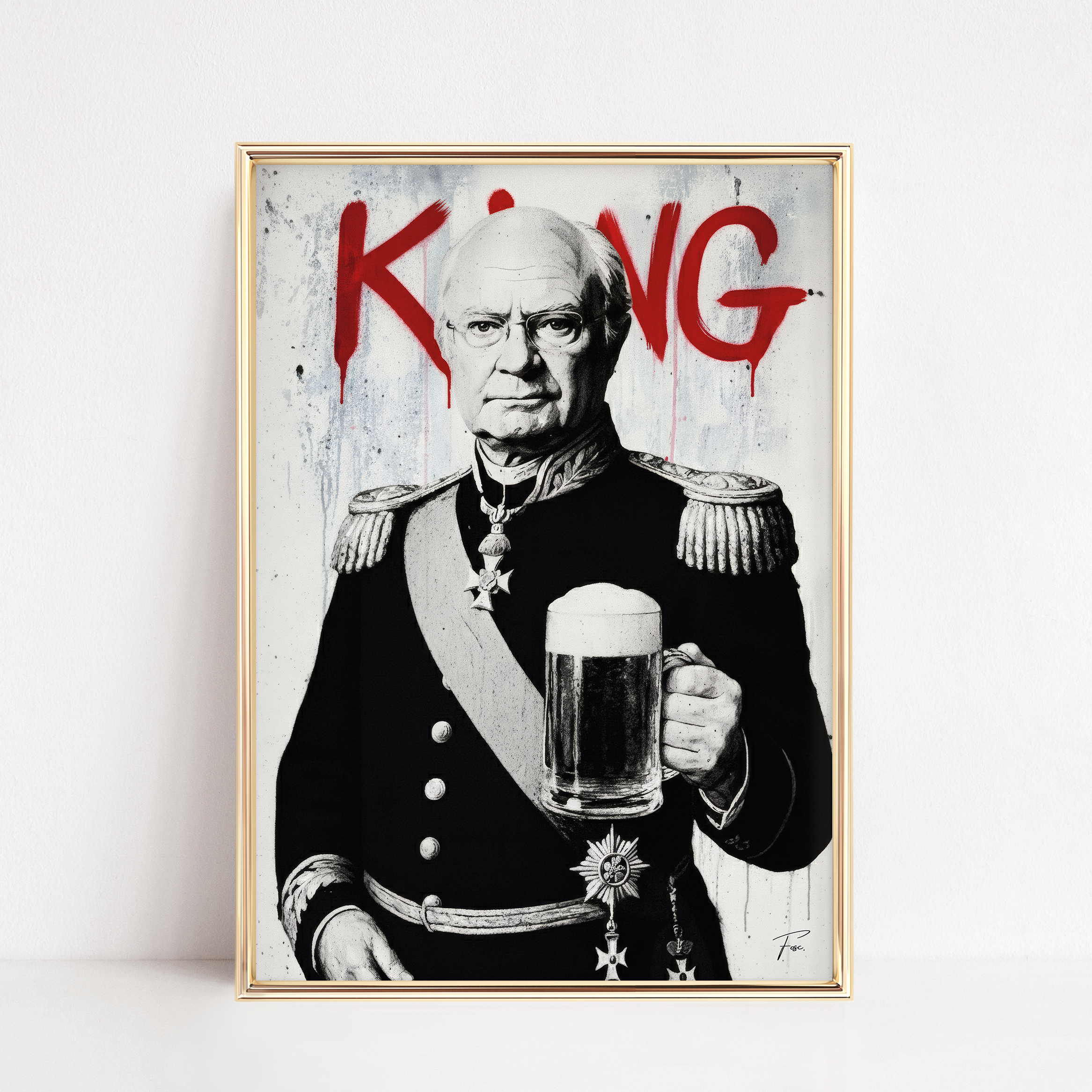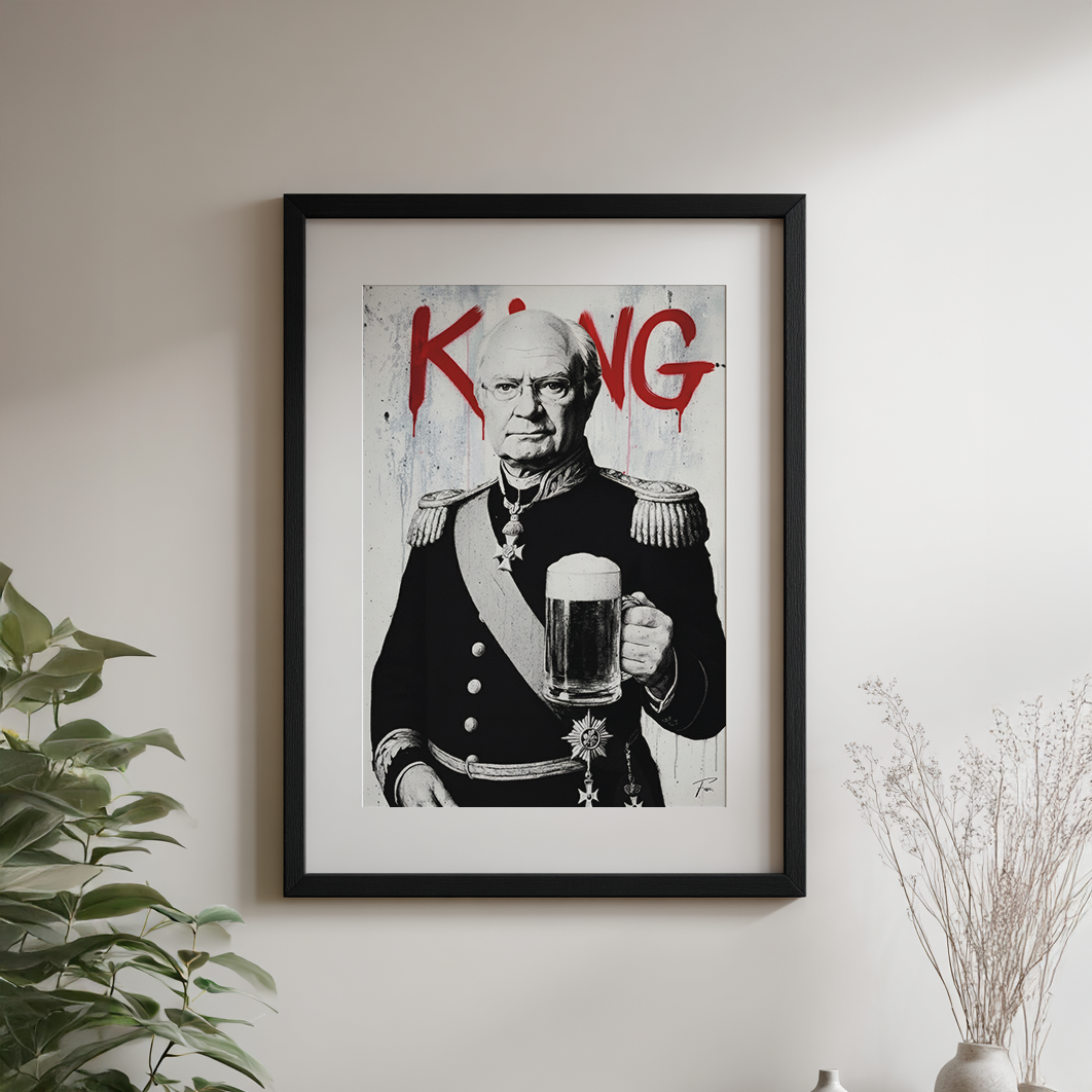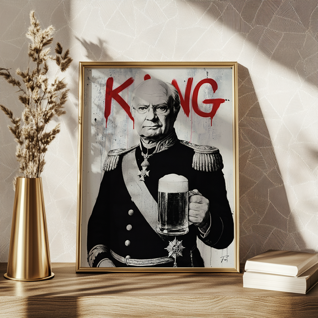 Wall art with a twist. Delivered as a high-quality poster. Royal by duty, casual by choice. Even kings know when it’s time to raise a glass.