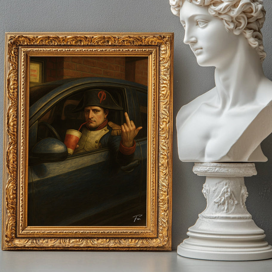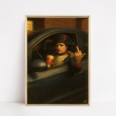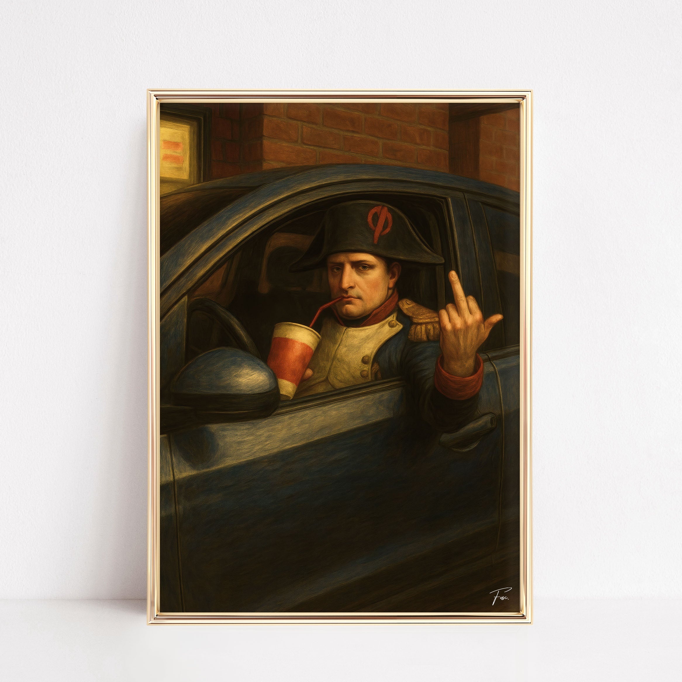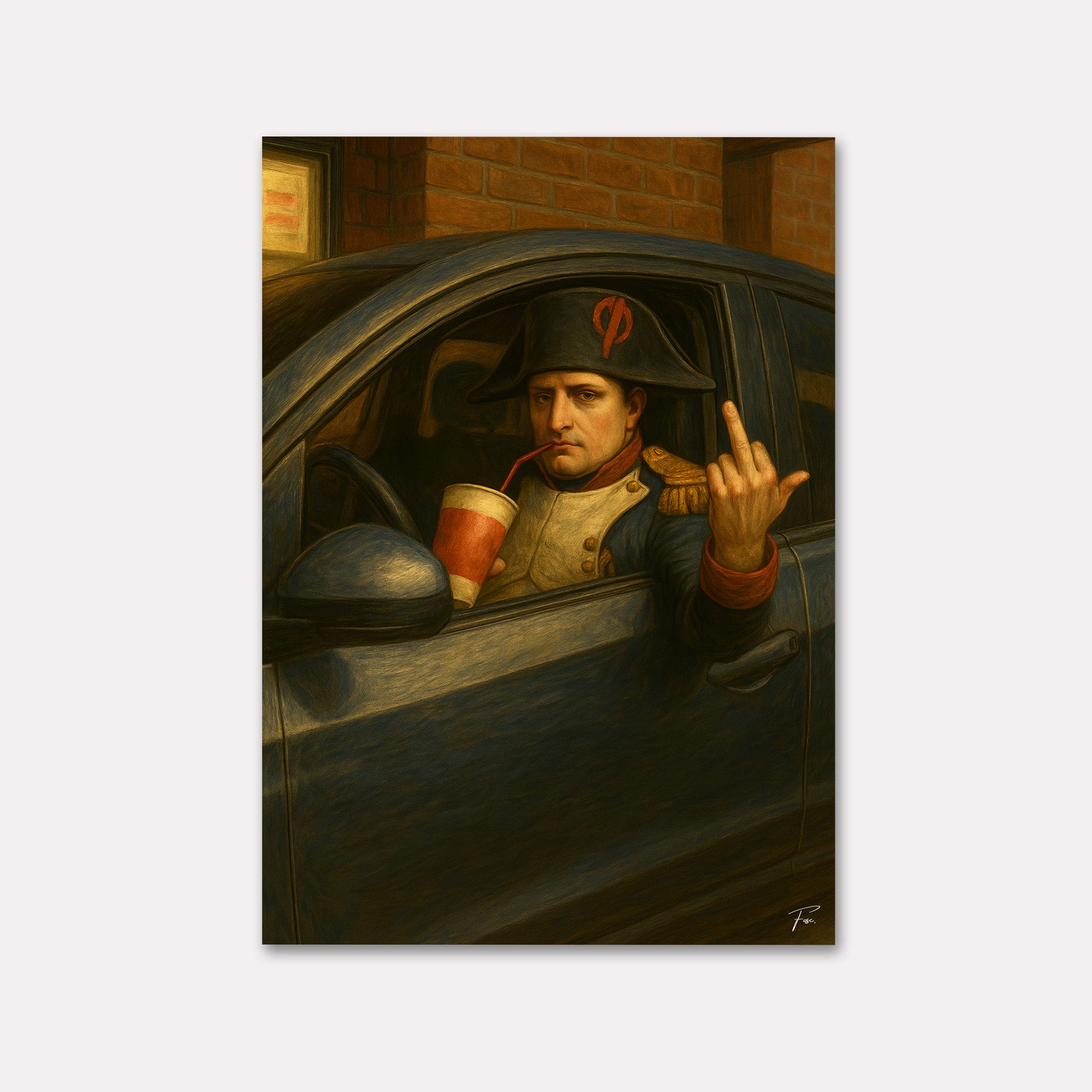 A bold poster for bold walls. He conquered nations but never left the car. A true modern ruler, medium fries, large ego.