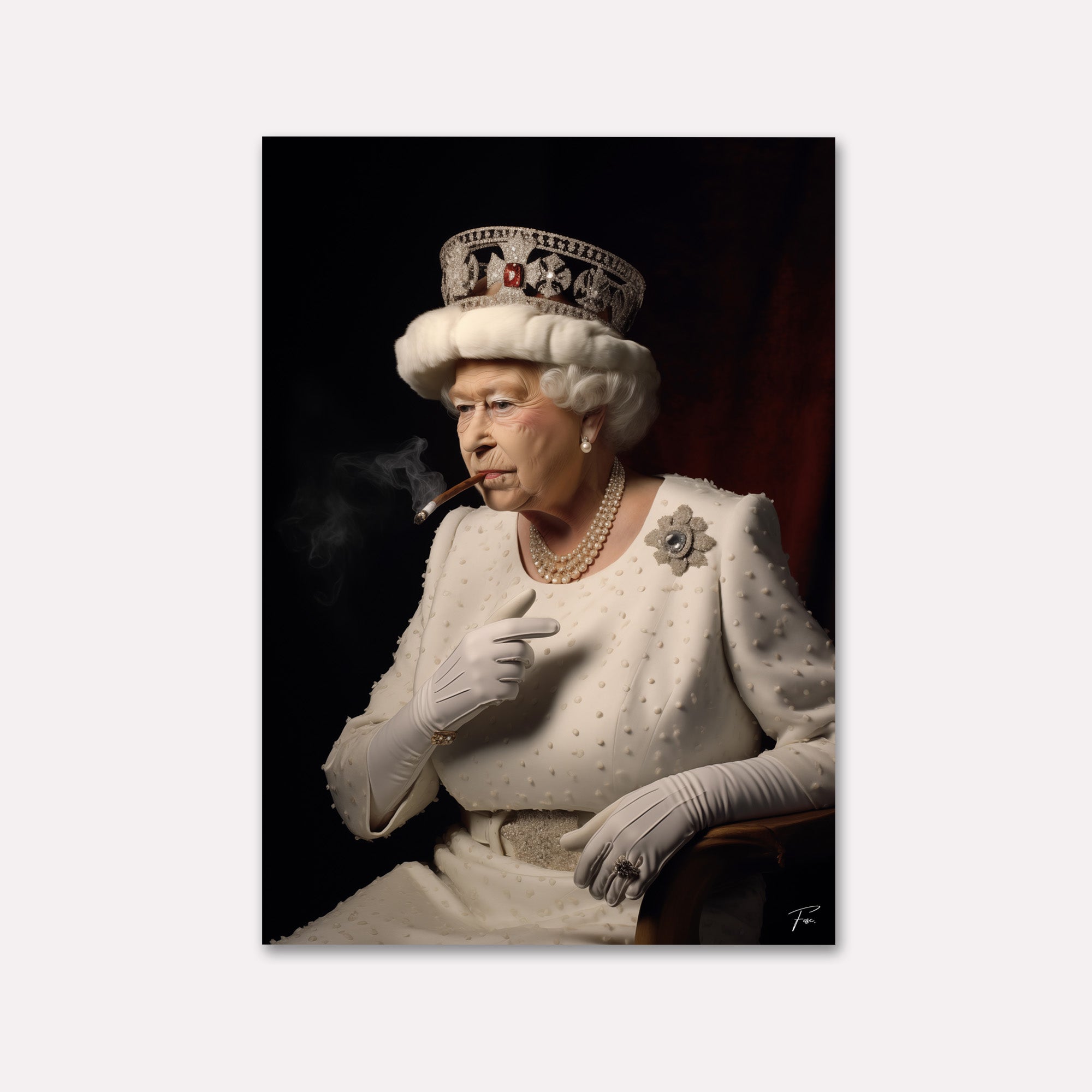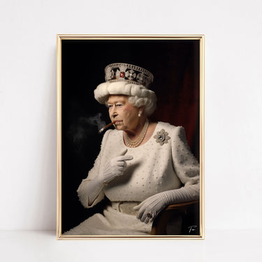 This print is perfect for those who appreciate a bold and unexpected twist on classic imagery. Featuring a striking portrait of the Queen holding a cigar, this artwork combines elegance with a touch of rebellion, making it a standout piece for any decor.