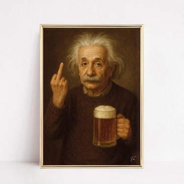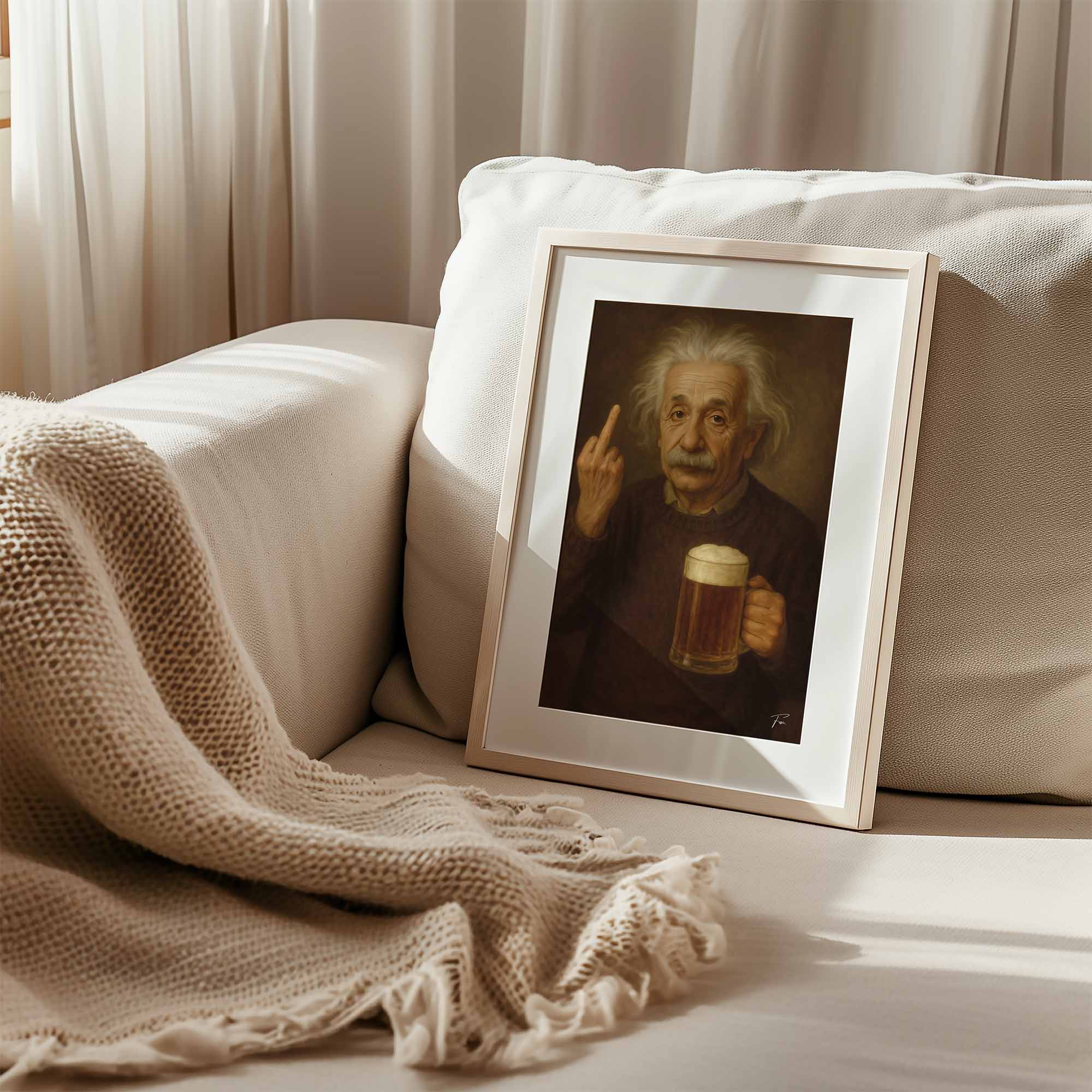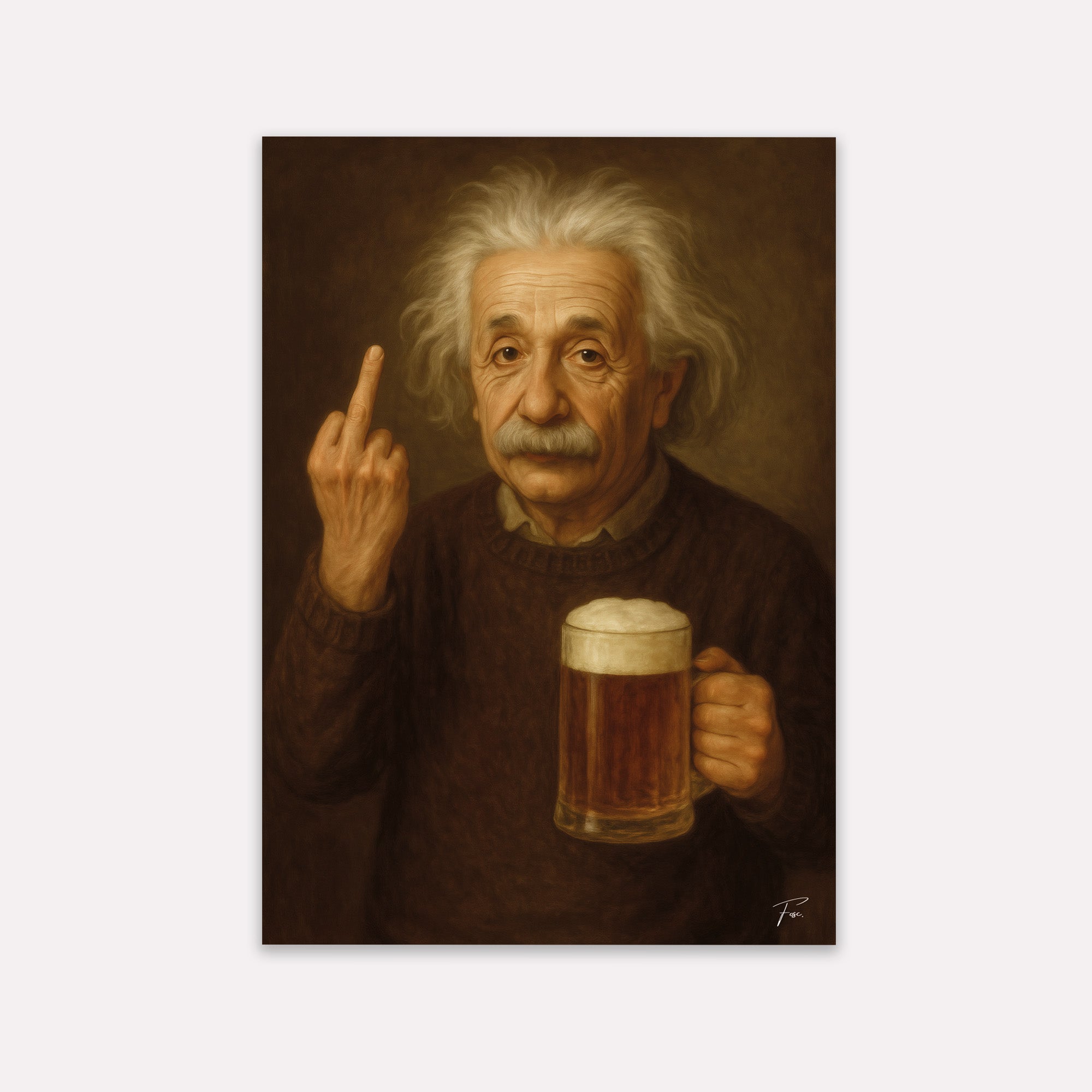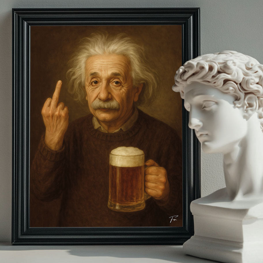 Wall art with a twist. Delivered as a high-quality poster. Genius on the chalkboard, rebel at the bar. Some theories expand the universe, others just raise a finger.